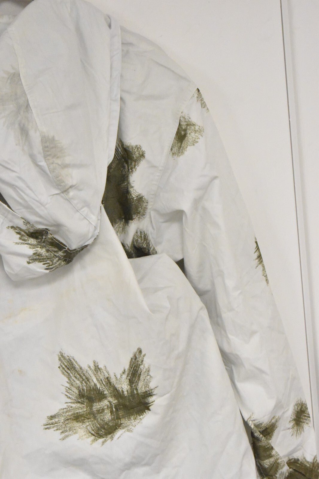 Genuine German Army Bundeswehr Snow Camouflage Suit, including both jacket and trousers. Designed for concealment in snowy environments, perfect for military surplus collectors, airsoft, and outdoor enthusiasts.