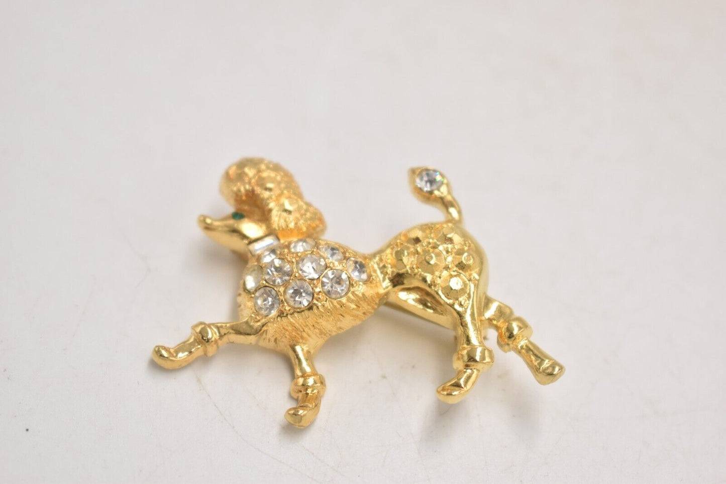 Add a touch of sparkle and charm to your outfit with this vintage poodle dog brooch. Crafted from gold-tone metal and adorned with rhinestones, it captures the playful spirit of a poodle in an elegant design.